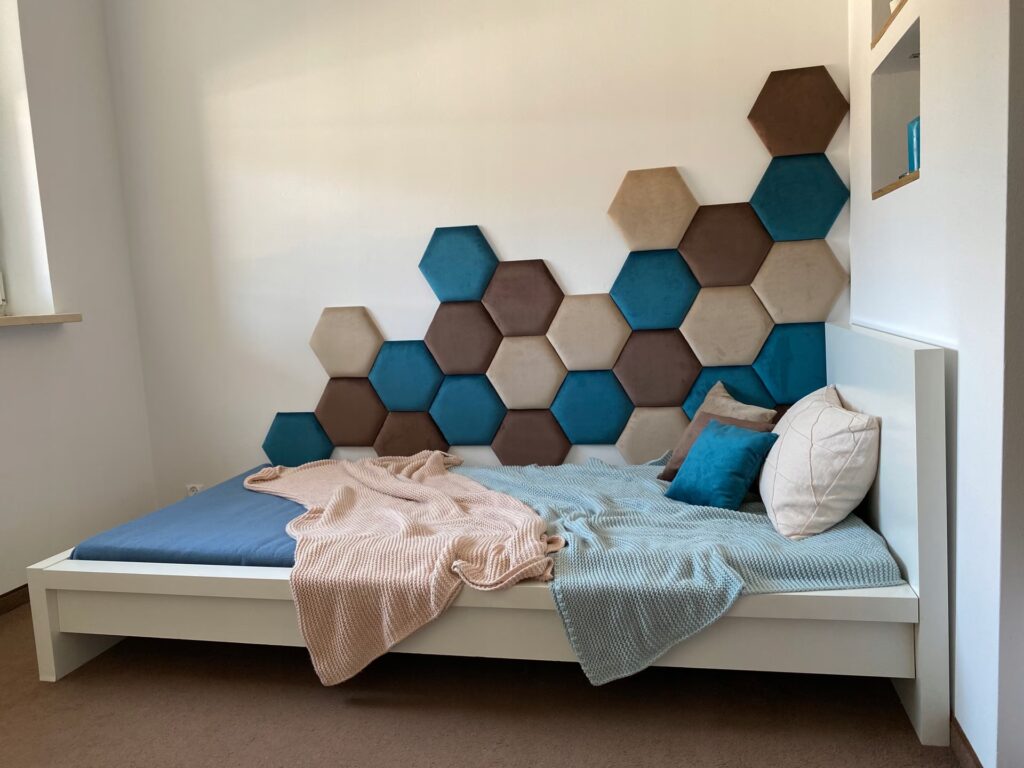 - Izolacja akustyczna: Panele tapicerowane doskonale pochłaniają dźwięki. Mogą znacząco wyciszyć pomieszczenie, redukując echo i hałasy dochodzące z zewnątrz lub z sąsiednich pomieszczeń. To idealne rozwiązanie do sypialni, pokoi dziecięcych, a także salonów czy biur, gdzie ważna jest cisza i komfort pracy lub wypoczynku.